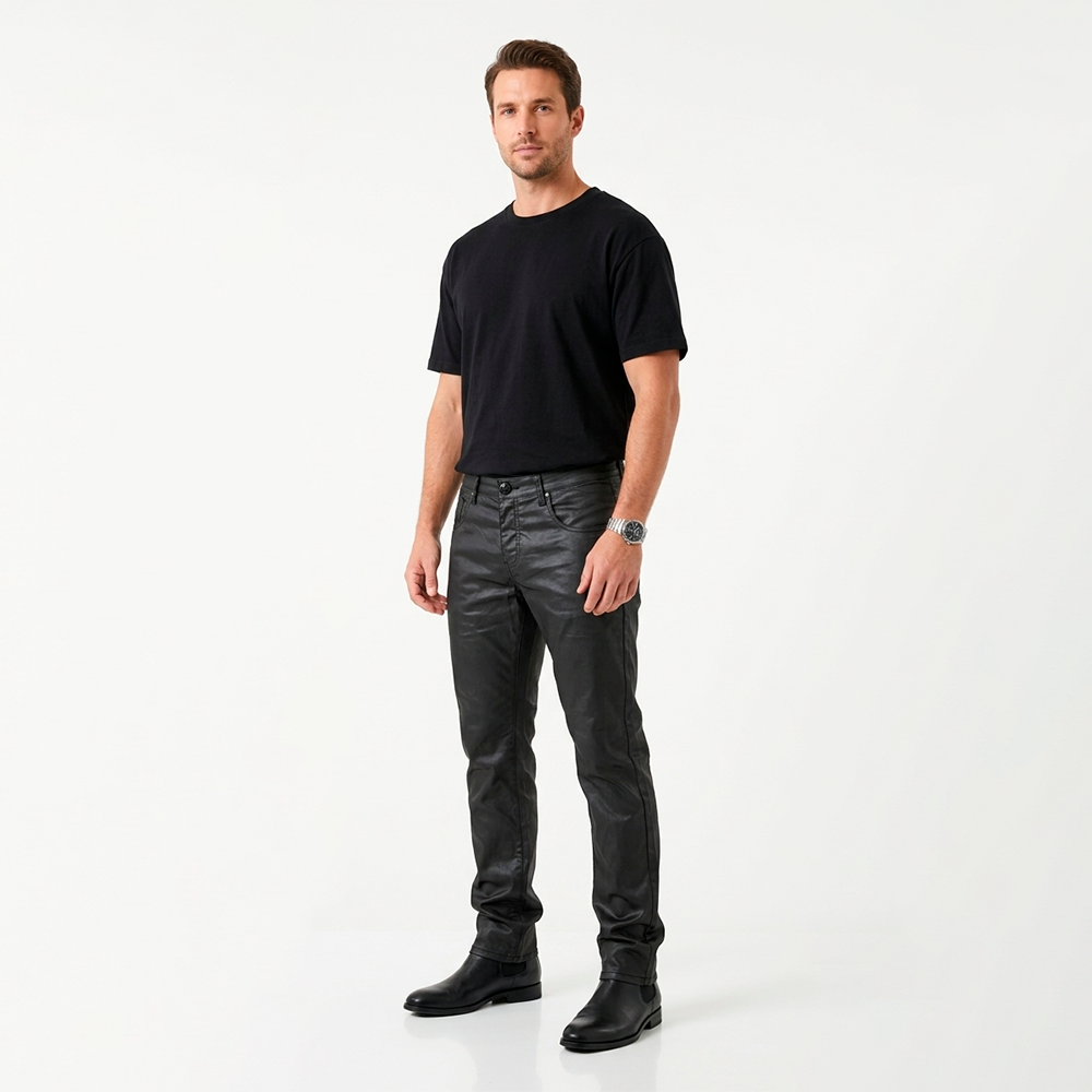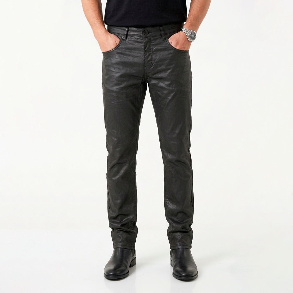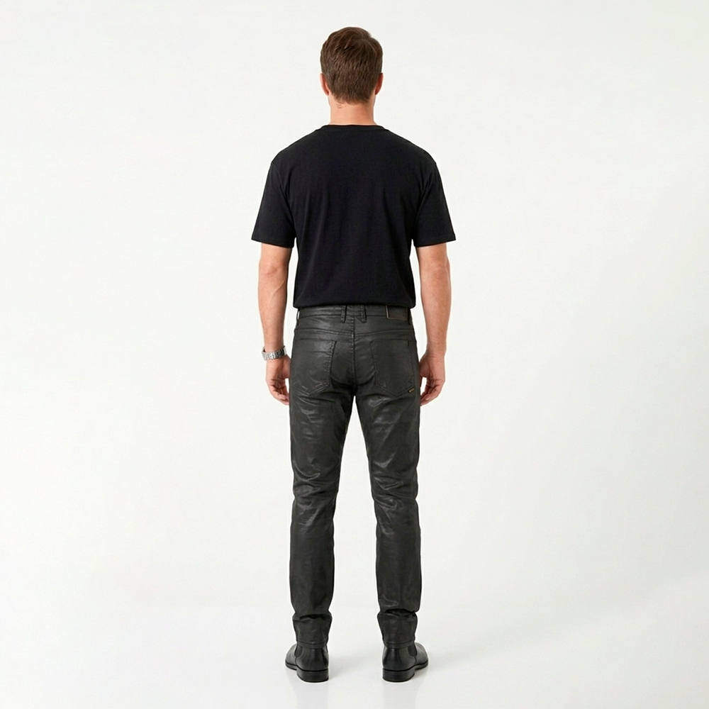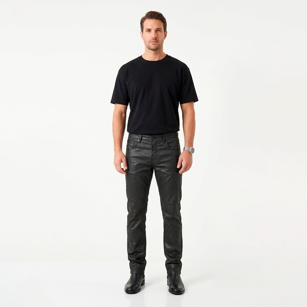 A calça preta encerada é a escolha perfeita para quem busca um visual moderno, sofisticado e com atitude. Com acabamento levemente brilhante, ela traz um efeito semelhante ao couro, elevando qualquer produção masculina — do casual ao urbano refinado.