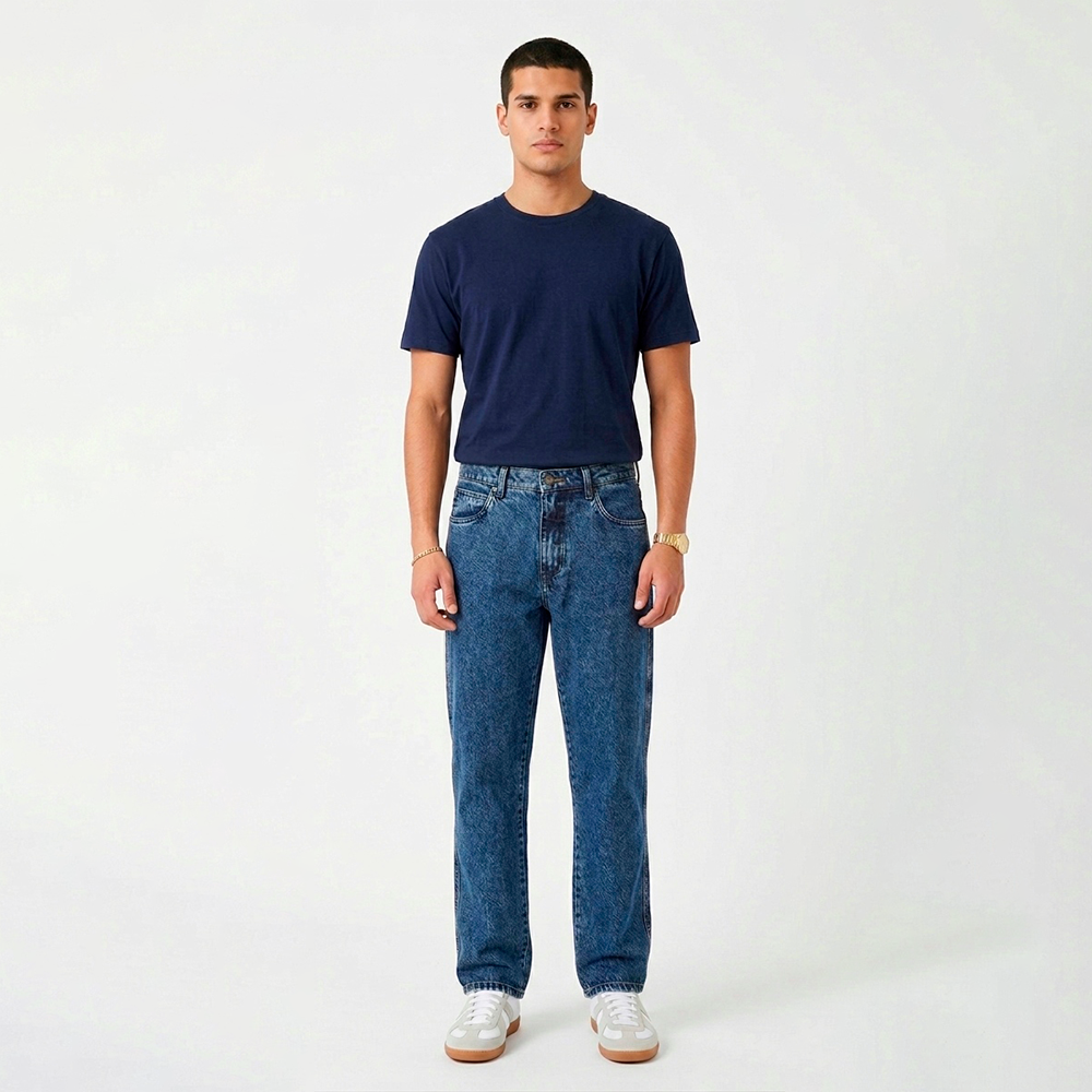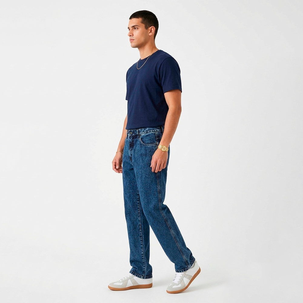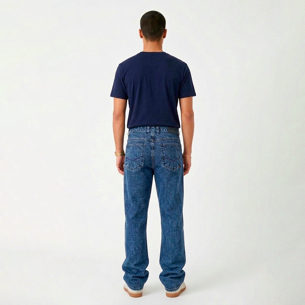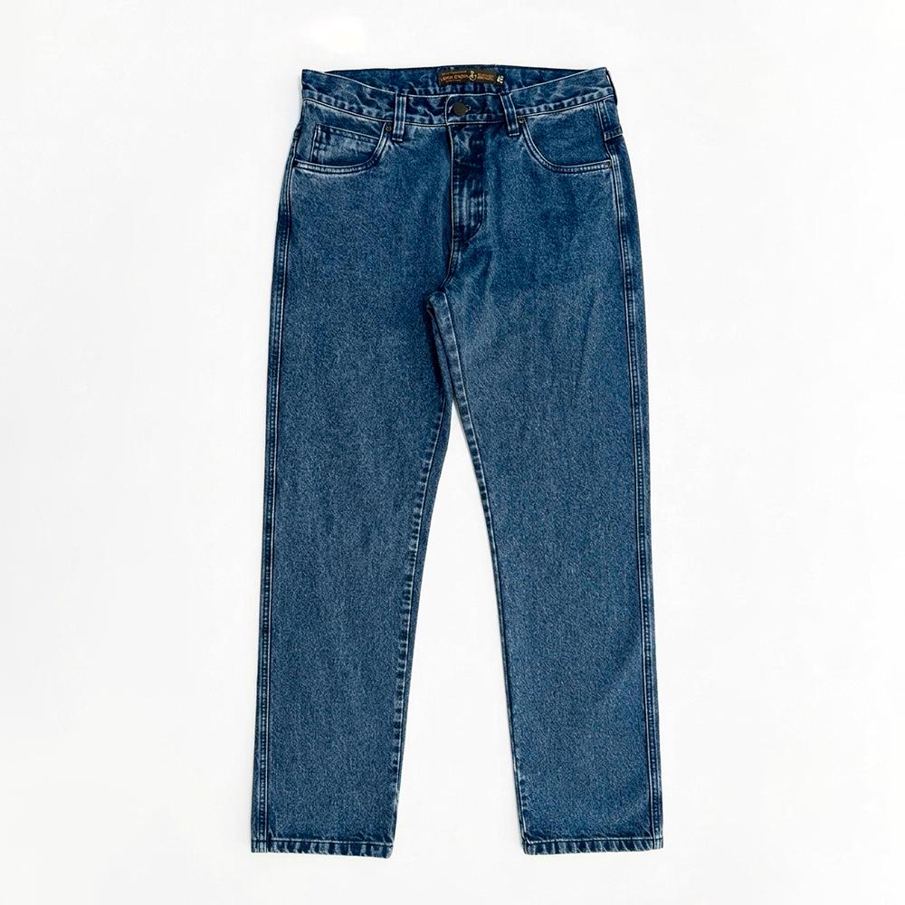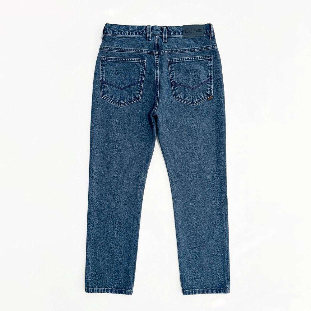 Jeans de alta gramatura 100% algodão, resistente, estruturada, costurada em linha azul combinando com a lavagem escura, deixando a peça mais clean